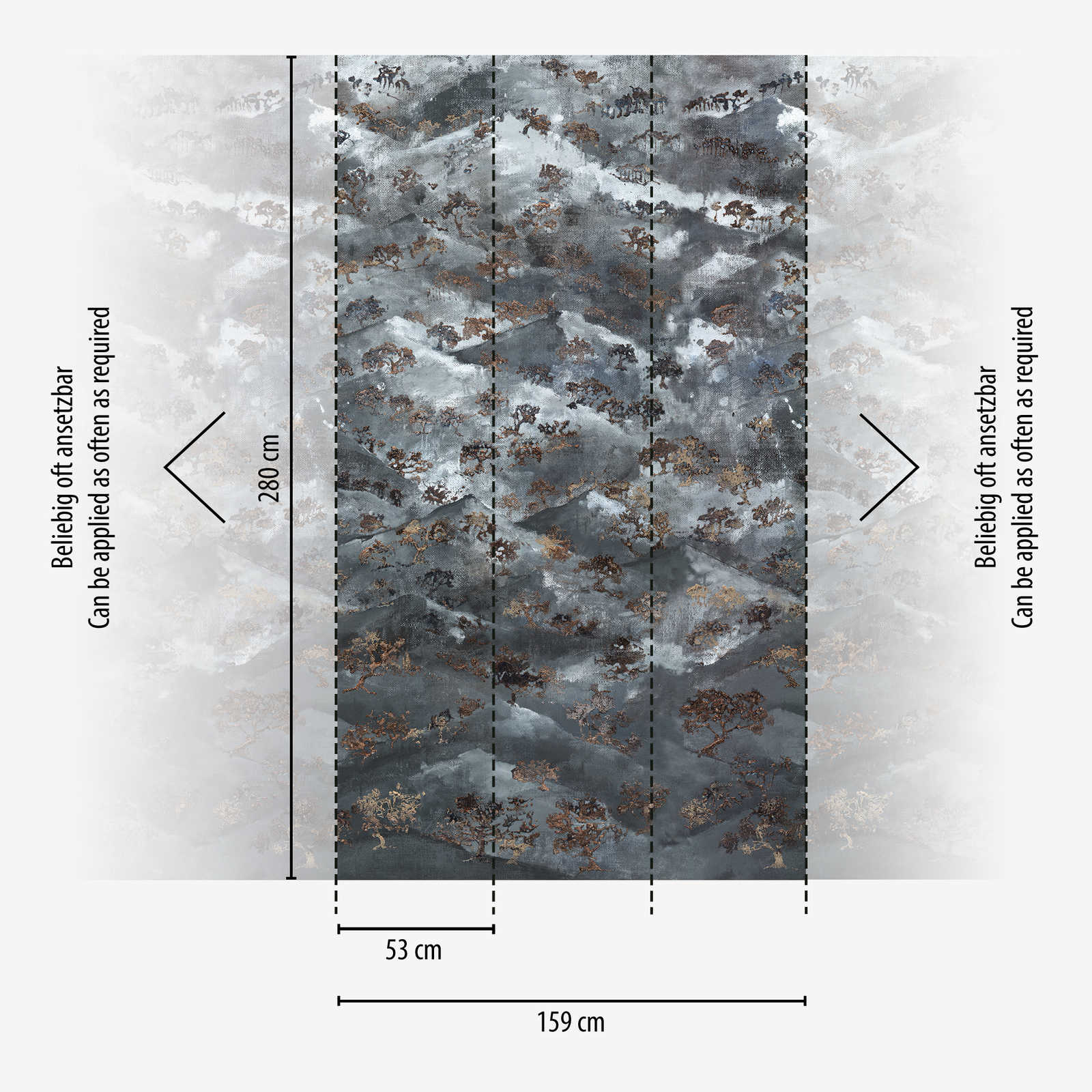Berglandschaft Tapete mit Bäumen in dunklen Farben – Blau, Grau, Gold