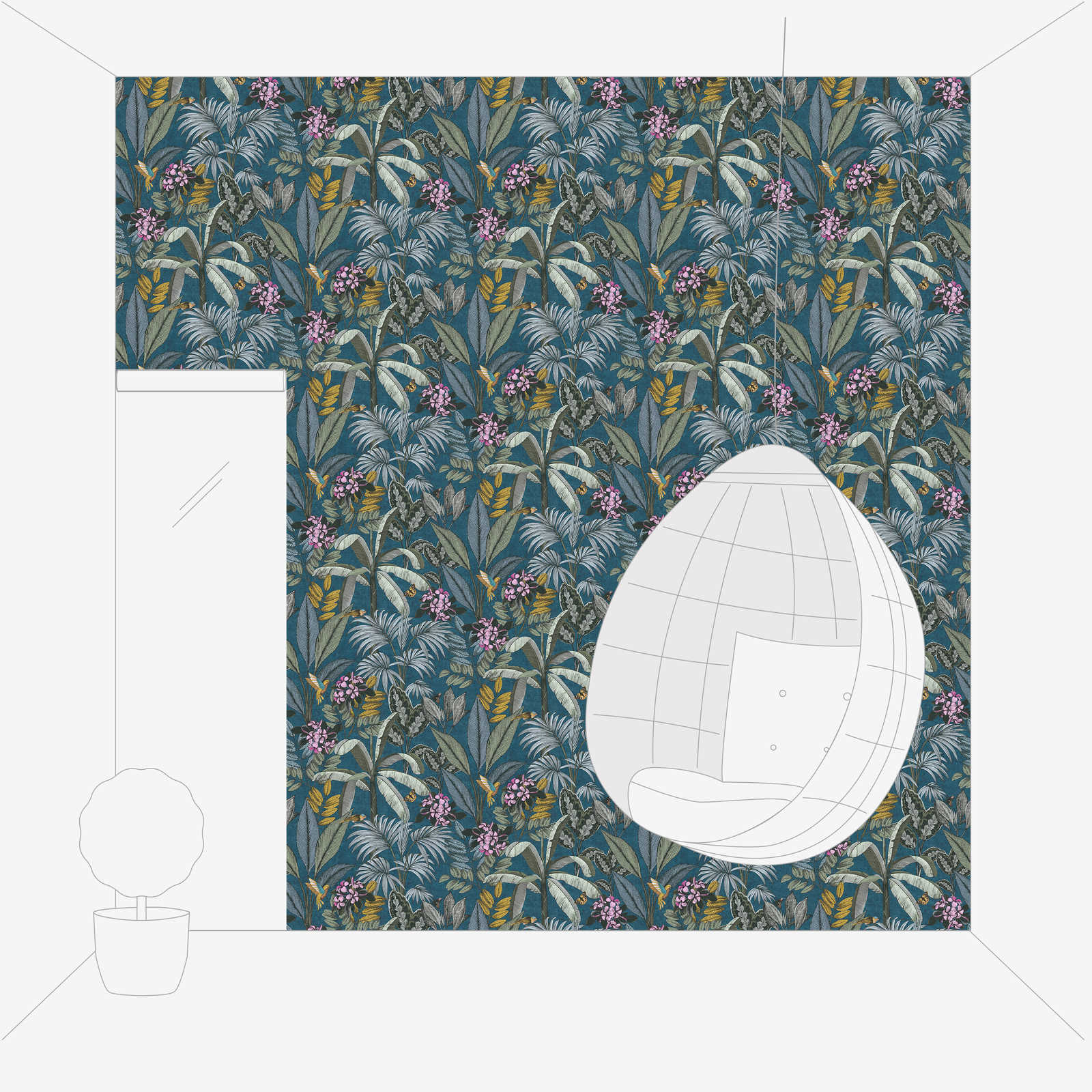 Blaue Tapete mit Dschungelmuster im Zeichenstil