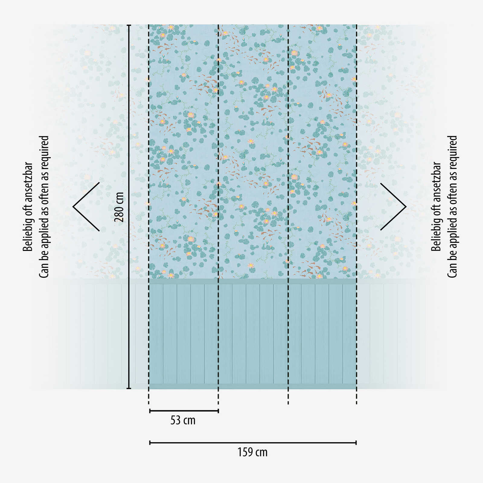 Blütenmeer Vliestapeten-Panel 159cm Breite x 280cm Höhe – Zartes Blumenmuster in fröhlichen Pastelltönen, glatte Oberfläche – Bunt, türkis