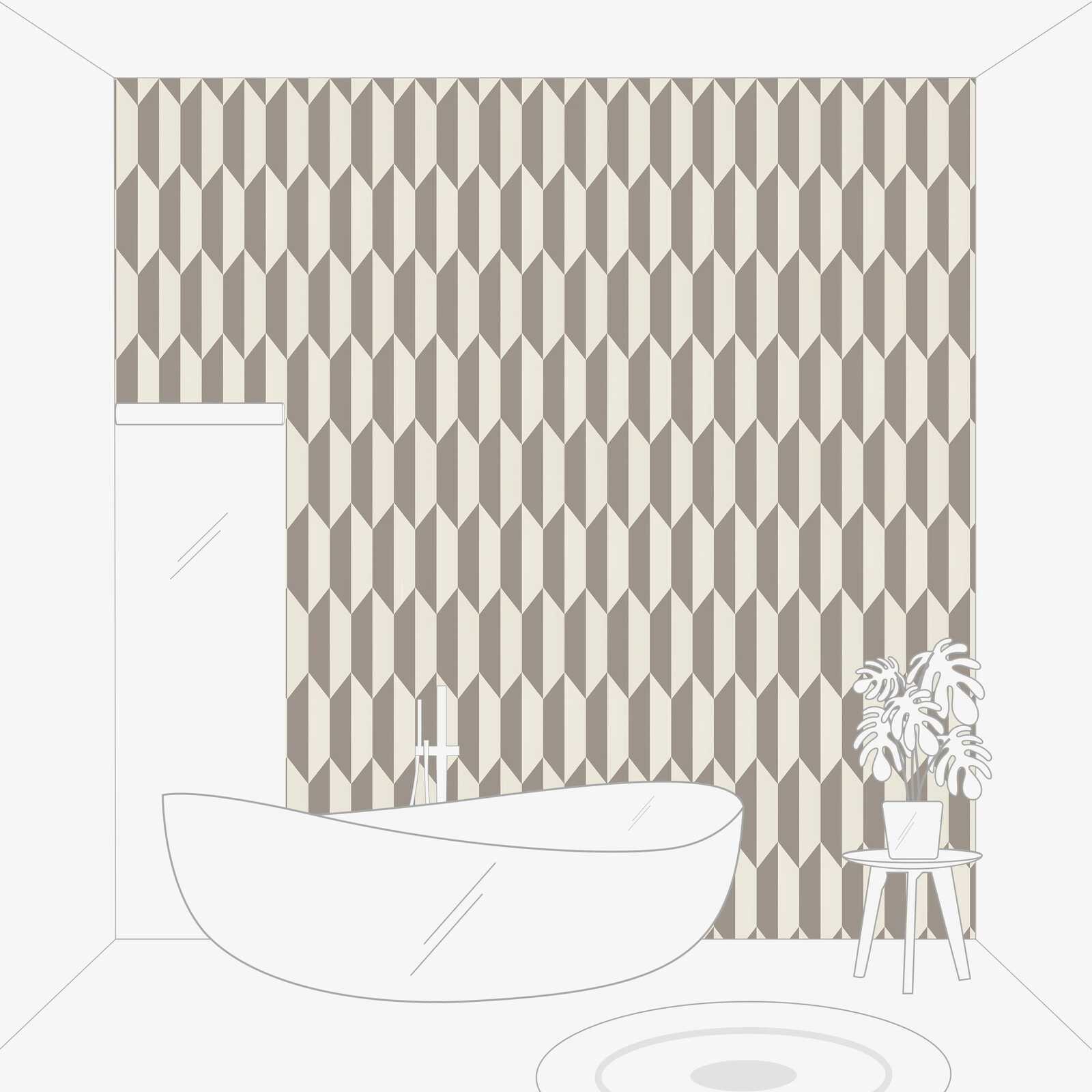Das Tapetenmotiv besteht aus einem geometrischen Muster aus nebeneinander angeordneten, länglichen Rautenformen, die in vertikalen Reihen verlaufen. Die Formen erinnern durch ihre Kanten und Flächen an facettenreiche Prismen oder Kristalle und erzeugen einen subtilen 3D-Effekt. Farblich wechseln sich zwei Töne ab: ein warmer, beigegrauer Farbton und ein leicht ins Creme gehende Weiß. Die Farbverteilung sorgt für optische Tiefe, wobei die hellen und dunkleren Flächen die geometrischen Formen zusätzlich betonen. Das Muster wirkt modern und puristisch, mit einem Hauch von Retro-Charme durch die Strenge der Wiederholung und die klare Linienführung. Die zurückhaltende, neutrale Farbpalette schafft eine ruhige und harmonische Raumatmosphäre und macht die Tapete zu einem vielseitig kombinierbaren Hintergrund.