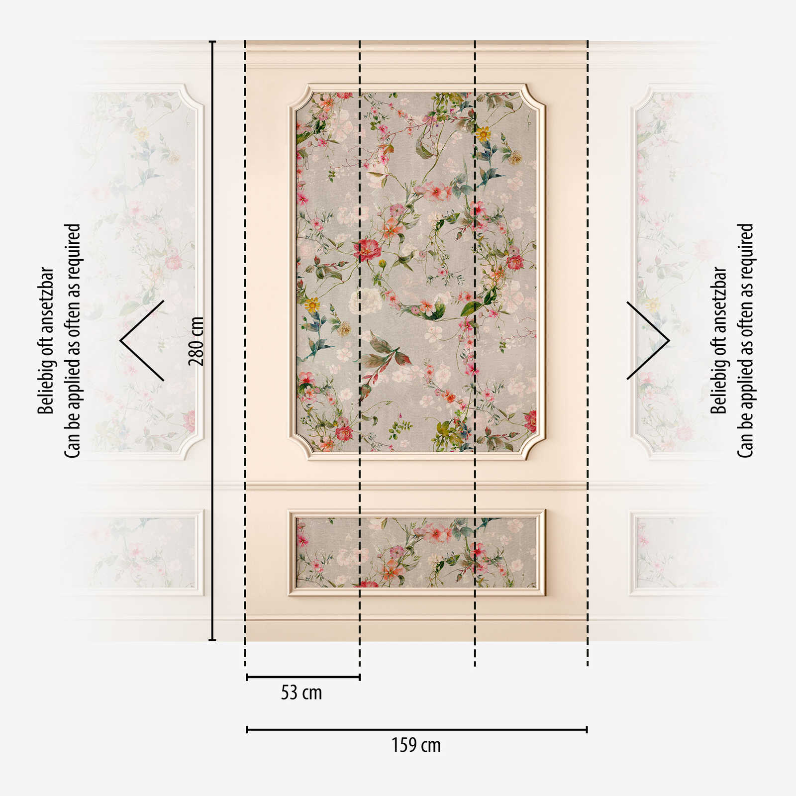 Elegante Vliestapete mit Wandkassettierung und buntem Blumenmotiv im Hintergrund – Beige, Grau, Bunt