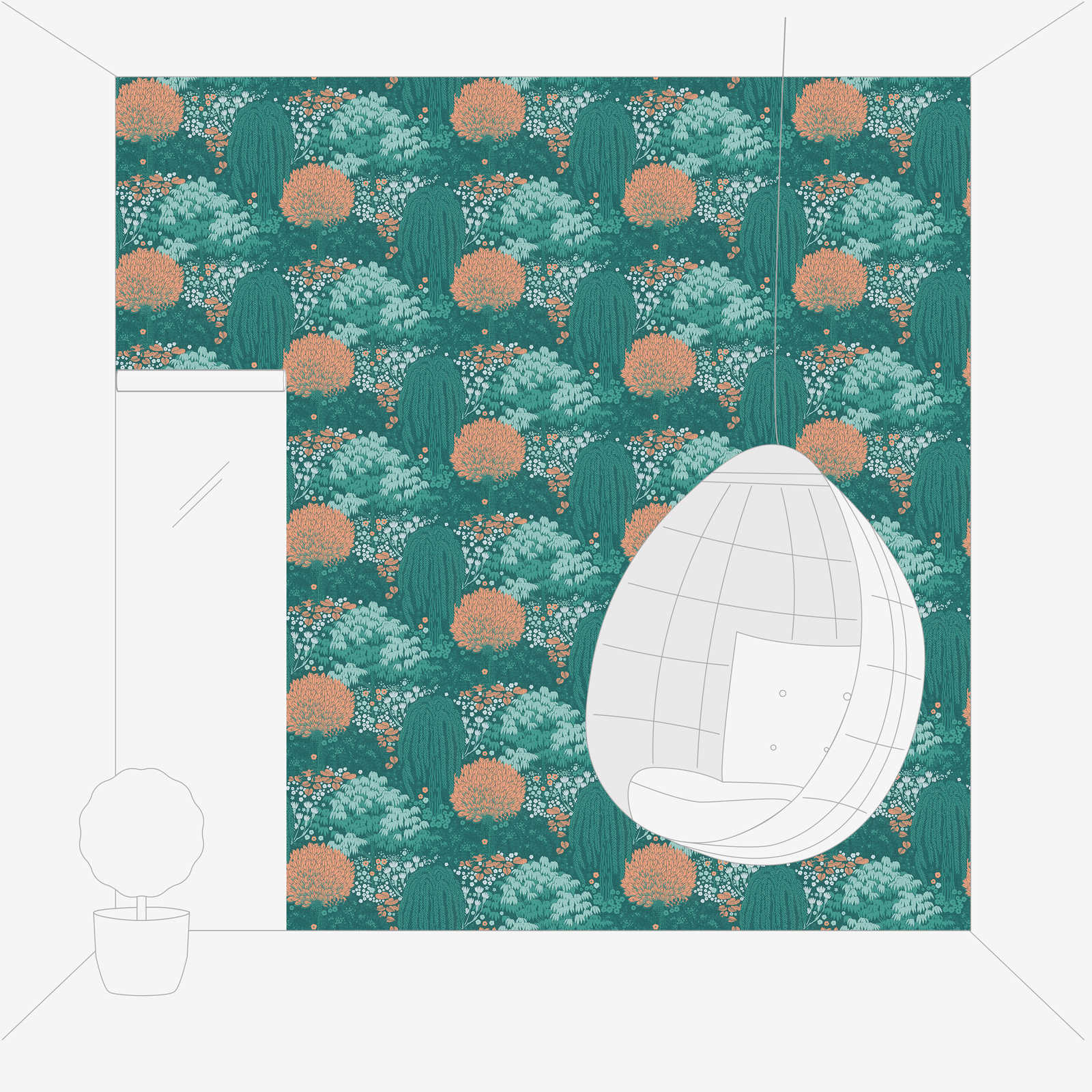 Florale Tapete mit Blättern leicht strukturiert, matt – Petrol, Orange, Grün