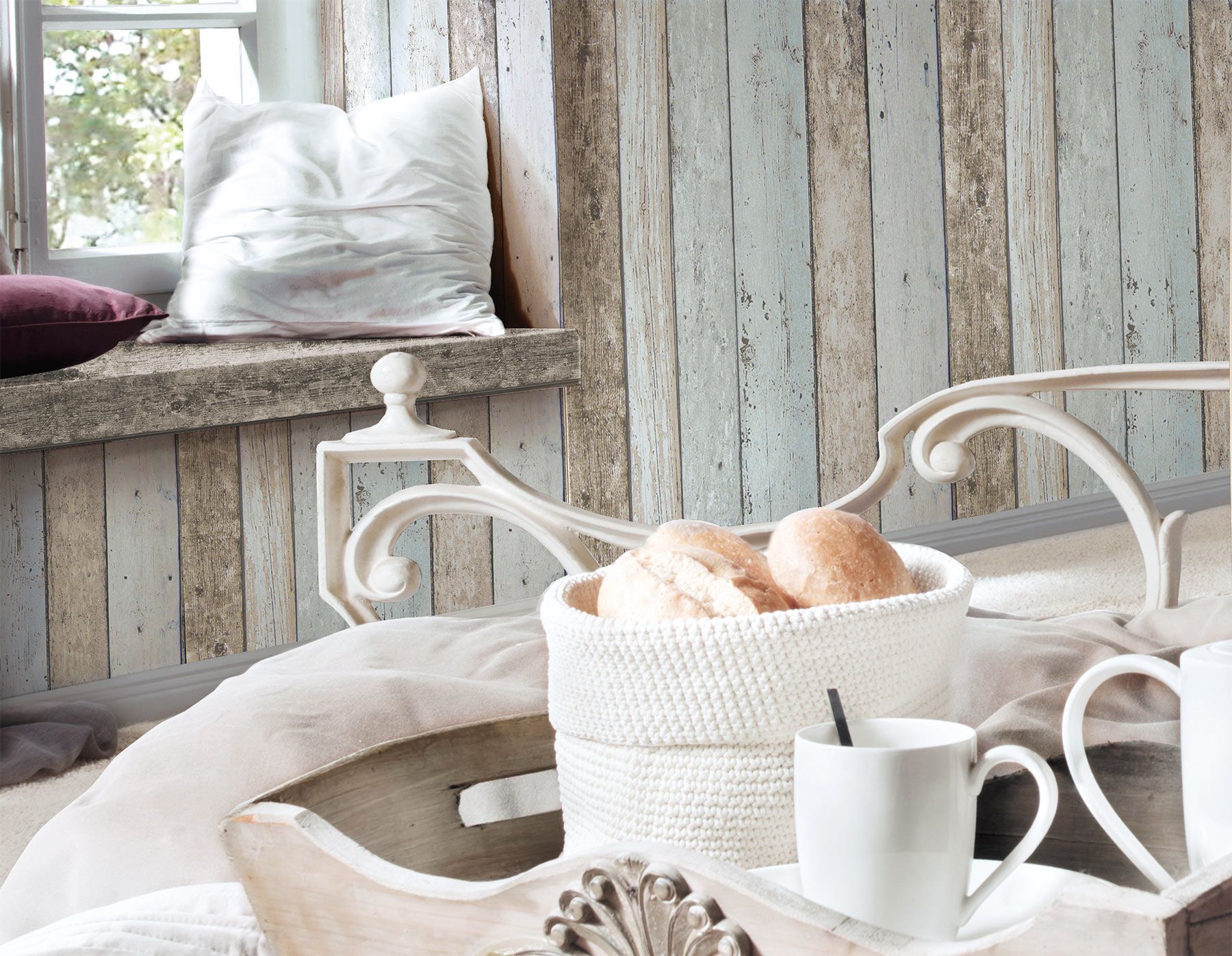 Holztapete mit buntem Brettermotiv im Shabby Chic Stil – Weiß, Braun, Blau