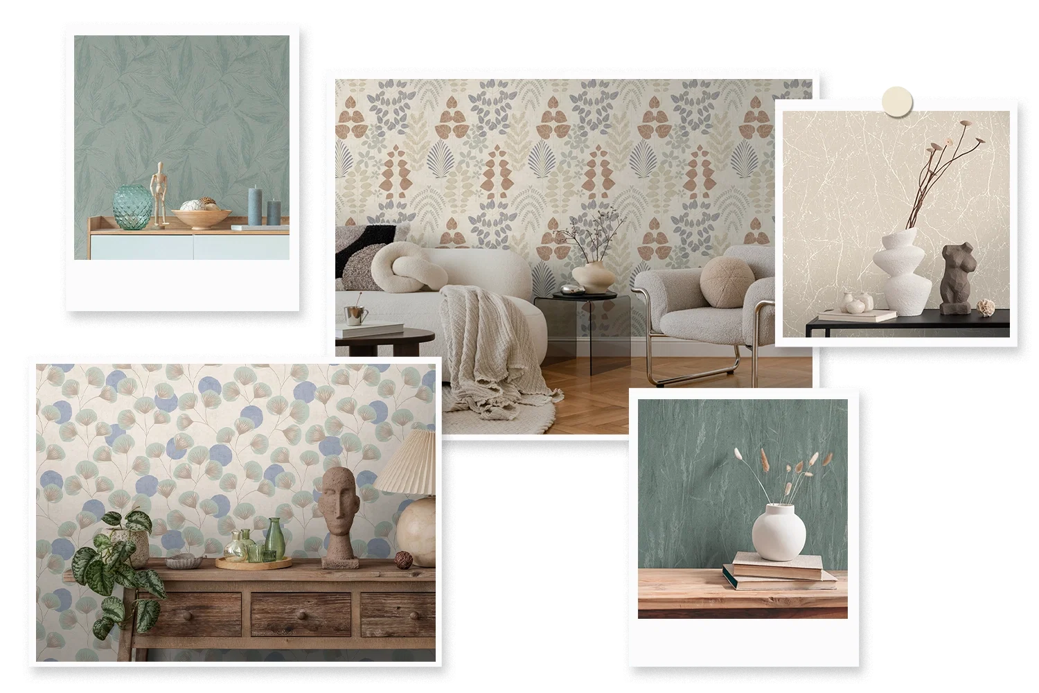 Zarte Blätter und feine Blumenmuster in nordischen Farbtönen verleihen Wänden Leichtigkeit und Harmonie. Diese Tapeten holen die Ruhe der Natur in dein Zuhause und laden zum Entspannen ein.