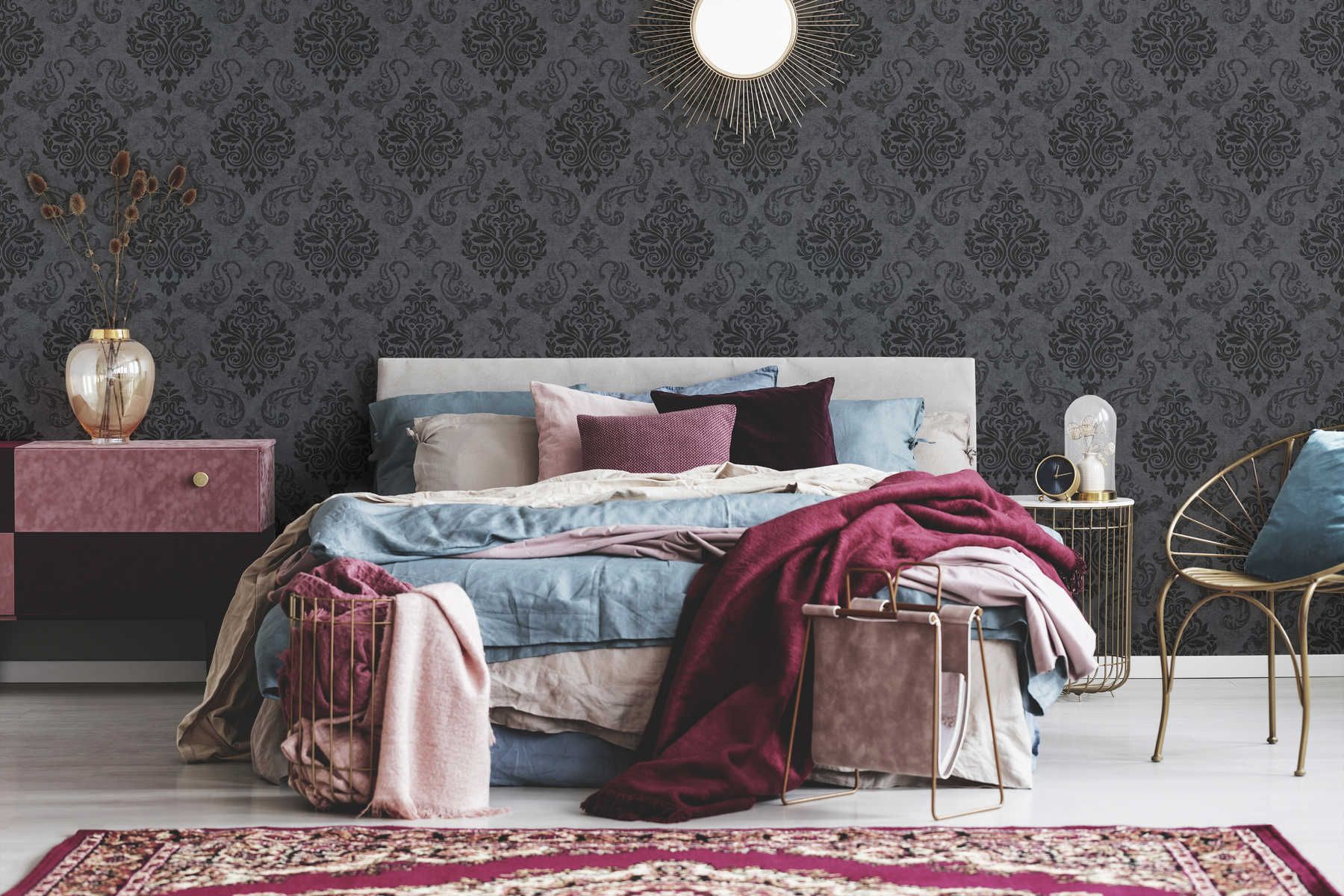 Ornamente Tapete Barock Stil mit Glitzereffekt – Grau, Metallic, Schwarz