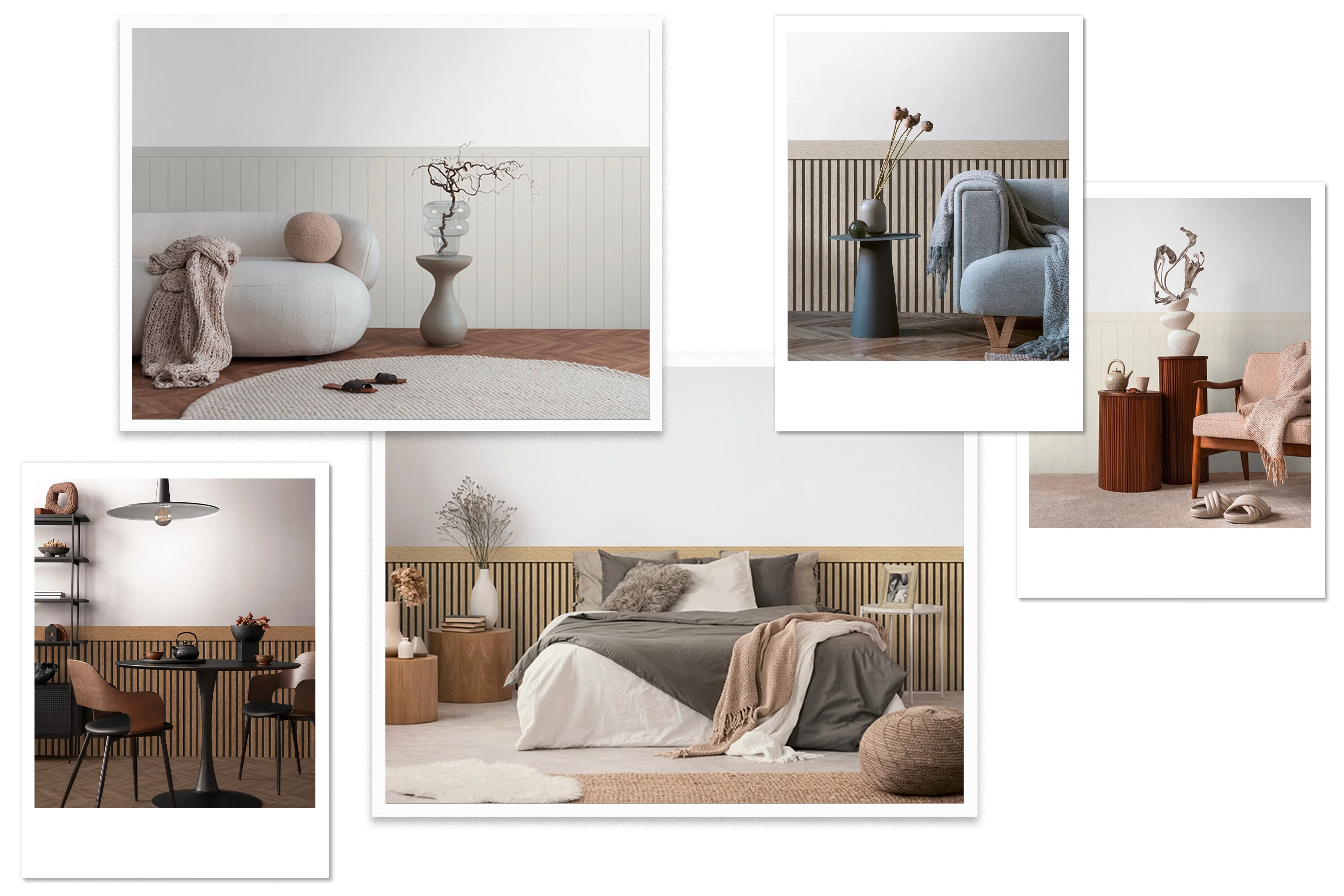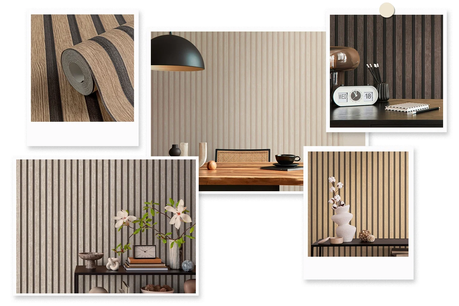 Braune, Beige und graue Holztöne bringen Ruhe und Struktur an die Wand. Klassisch und modern zugleich.