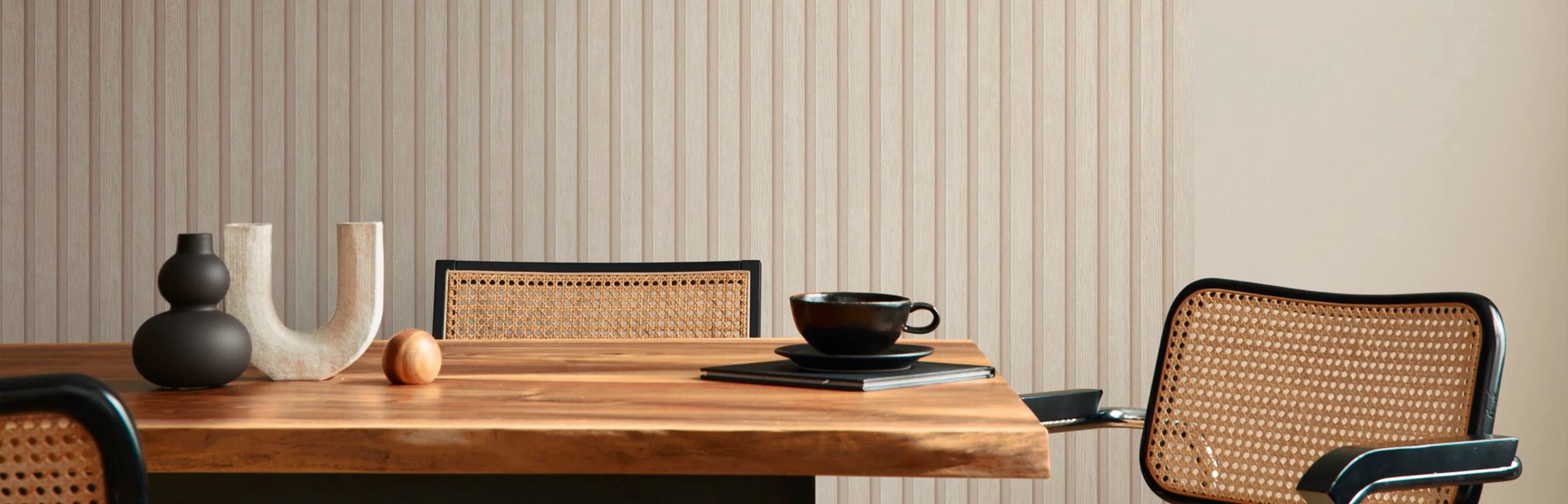 Quer tapeziert wirkt der Akustikpaneel Look wie ein stilvoller Wandabschluss mit klarer Linie. Eine spannende Lösung für Wände, die mehr Kontur vertragen können.