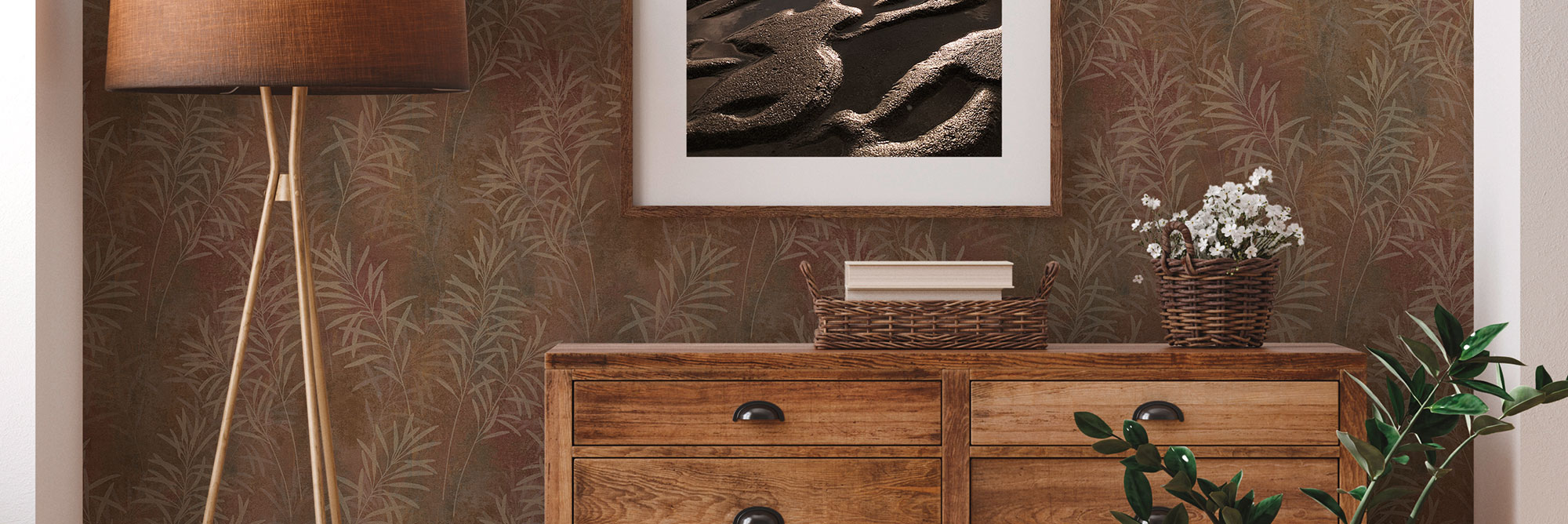 Florale Vliestapete mit Astmuster – Braun, Weiß