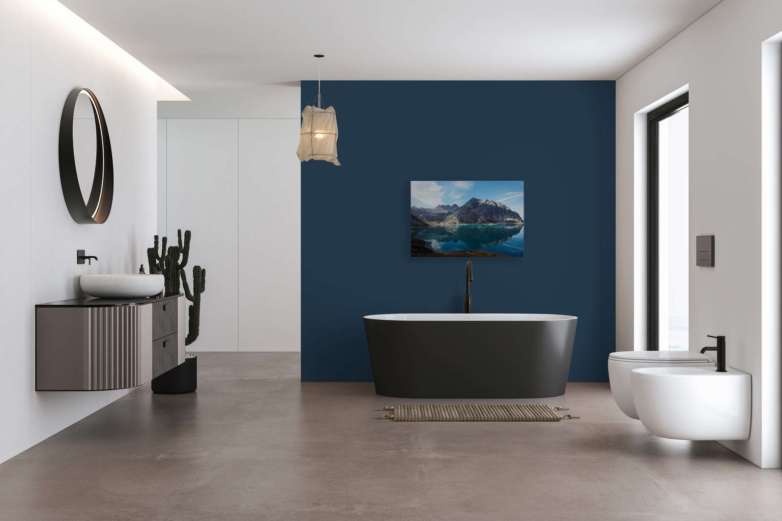 Leinwandbild mit Bergen und blauem Himmel am Wasser – 0,90 m x 0,60 m