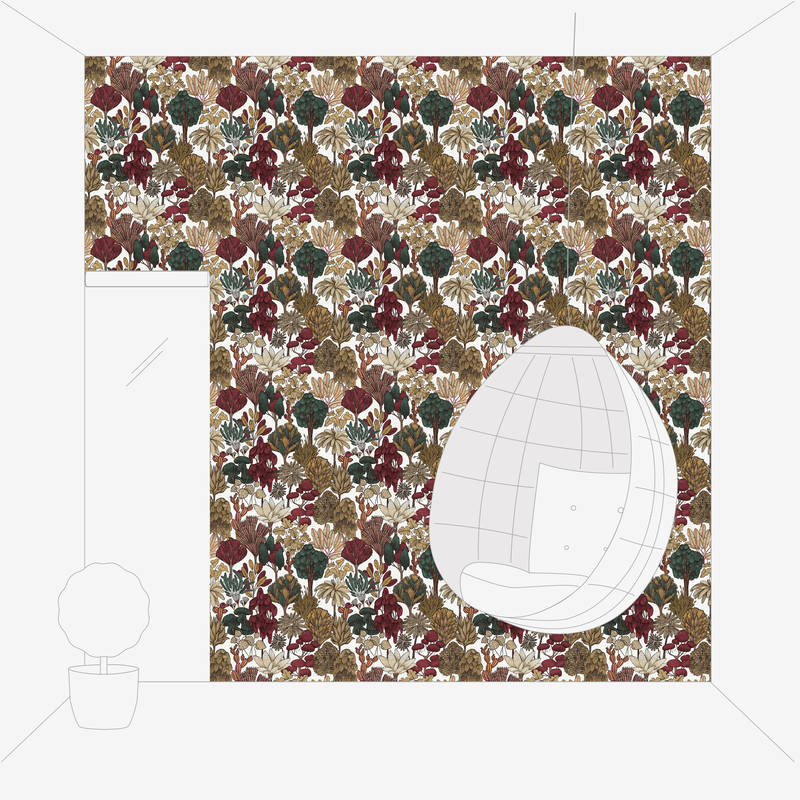 Moderne Tapete floral mit Bäumen im Zeichenstil – Rot, Beige, Braun