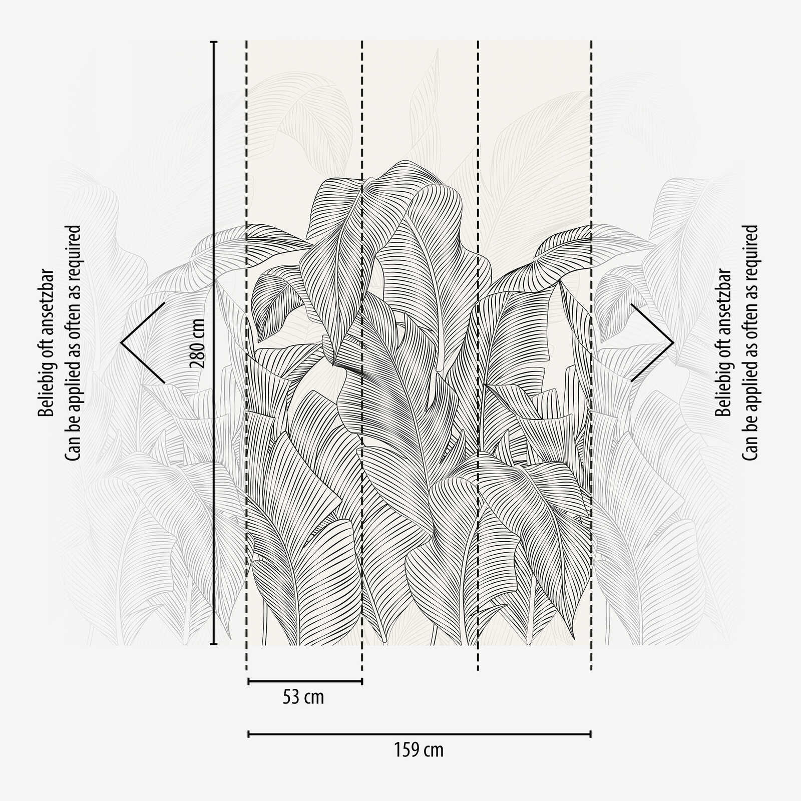 Große, üppige Bananenblätter dominieren das Motiv und schaffen eine dichte, tropische Blattlandschaft. Die Konturen und feinen Blattadern sind mit klaren, schwarzen Linien auf einem hellen, fast weißen Hintergrund gezeichnet. Das Design lebt von der linearen, grafischen Stilistik, bei der die rhythmische Linienführung den Blättern Struktur und Tiefe verleiht. Im Hintergrund sind die Blätter in einem helleren Grauton angedeutet, was dem Muster mehr Dimensionalität und Leichtigkeit verleiht. Die Farbwelt ist auf zurückhaltendes Schwarz-Weiß und dezente Grautöne beschränkt, wodurch eine ruhige und dennoch sehr elegante, moderne Wirkung entsteht. Das Motiv vermittelt eine Kombination aus Urban Jungle und zeitloser, minimalistischer Ästhetik, die je nach Einrichtung sowohl als Statement als auch als stilvoller Hintergrund wirken kann.