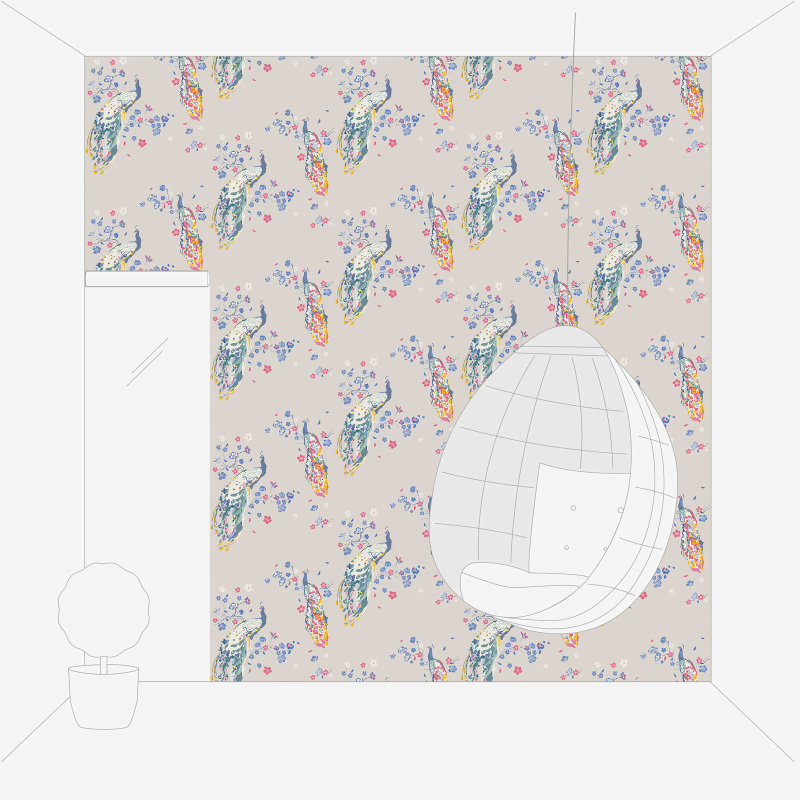 Mustertapete mit Pfaumuster und Glanzeffekt – Beige, Blau, Bunt