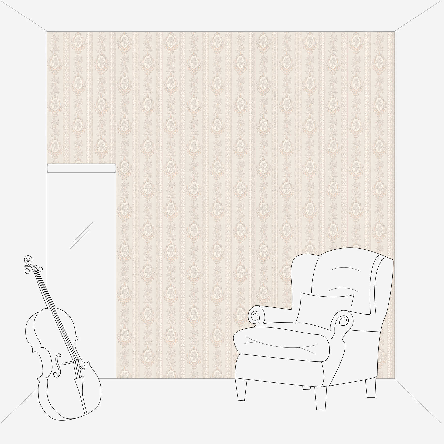 Zartes, klassisches Barockmuster bestimmt das Erscheinungsbild dieser Tapete. Auf einem cremig-beigen Hintergrund ziehen sich senkrechte Bahnen aus ornamentalen Verzierungen, unterbrochen von Medaillons, in denen filigrane Blumenbukette eingearbeitet sind. Die Farben bewegen sich in einem sanften Spektrum aus Elfenbein, hellem Beige und pudrigen Pastelltönen, was der Tapete eine elegante, zurückhaltende Wirkung verleiht. Die feinen Reliefstrukturen unterstreichen den hochwertigen Charakter und sorgen, je nach Lichteinfall, für subtile Schattenspiele auf der Oberfläche. Insgesamt strahlt die Tapete eine zeitlose, ruhige Atmosphäre aus, die an klassische Interieurs erinnert, ohne aufdringlich zu wirken.