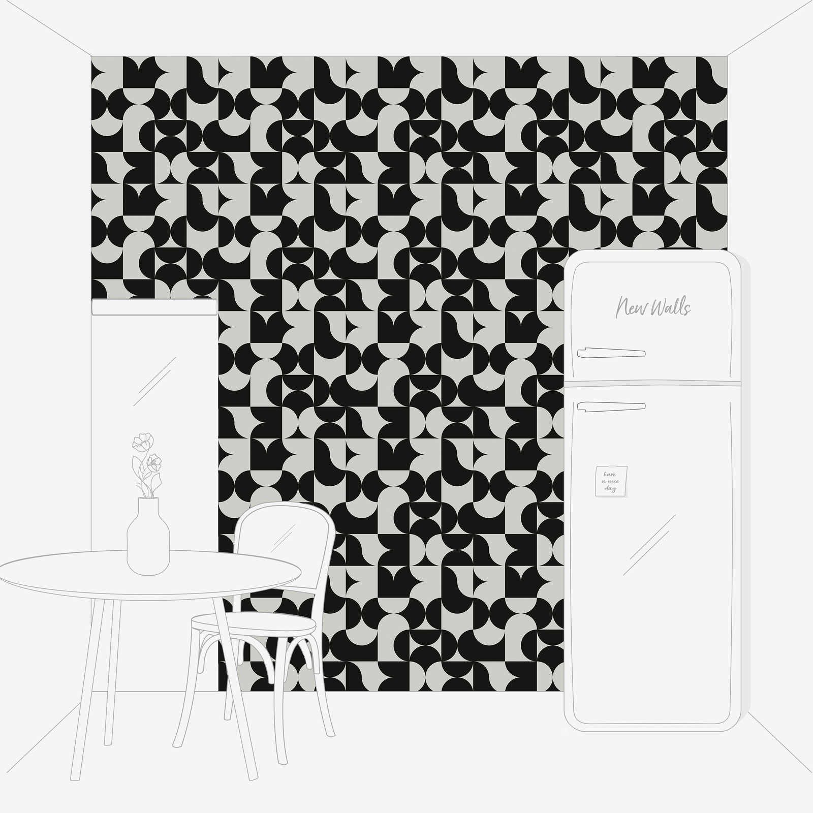 Ein geometrisches, abstraktes Muster aus monochromen Elementen prägt die Tapete. Schwarze und weiße Formen wechseln sich in einer spannungsvollen Harmonie ab. Die Formen sind eine Mischung aus Halbkreisen, Viertelkreisen und quadratischen Elementen, die zusammen einen visuellen Rhythmus bilden. Der Kontrast zwischen Schwarz und Weiß erzeugt eine klare, moderne Wirkung. Der Stil ist minimalistisch und erinnert an die Ästhetik des Bauhauses, mit einem Fokus auf Struktur und Symmetrie. Die Farbwelt wirkt kühl und elegant, ideal für Räume, die einen Hauch von moderner Raffinesse und grafischer Klarheit suchen.