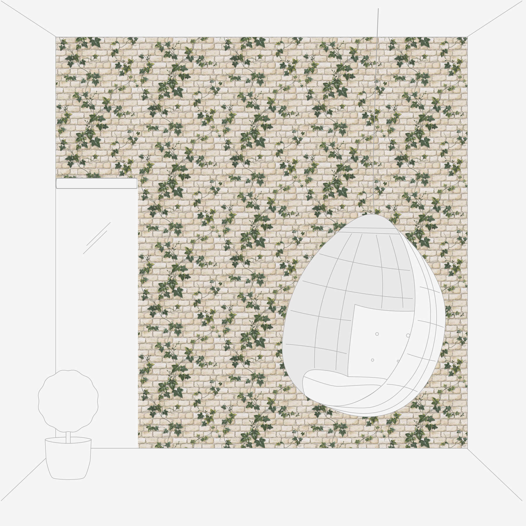 Tapete mit Mauerwerk & Efeu-Ranken, Steinoptik – Weiß, Grün