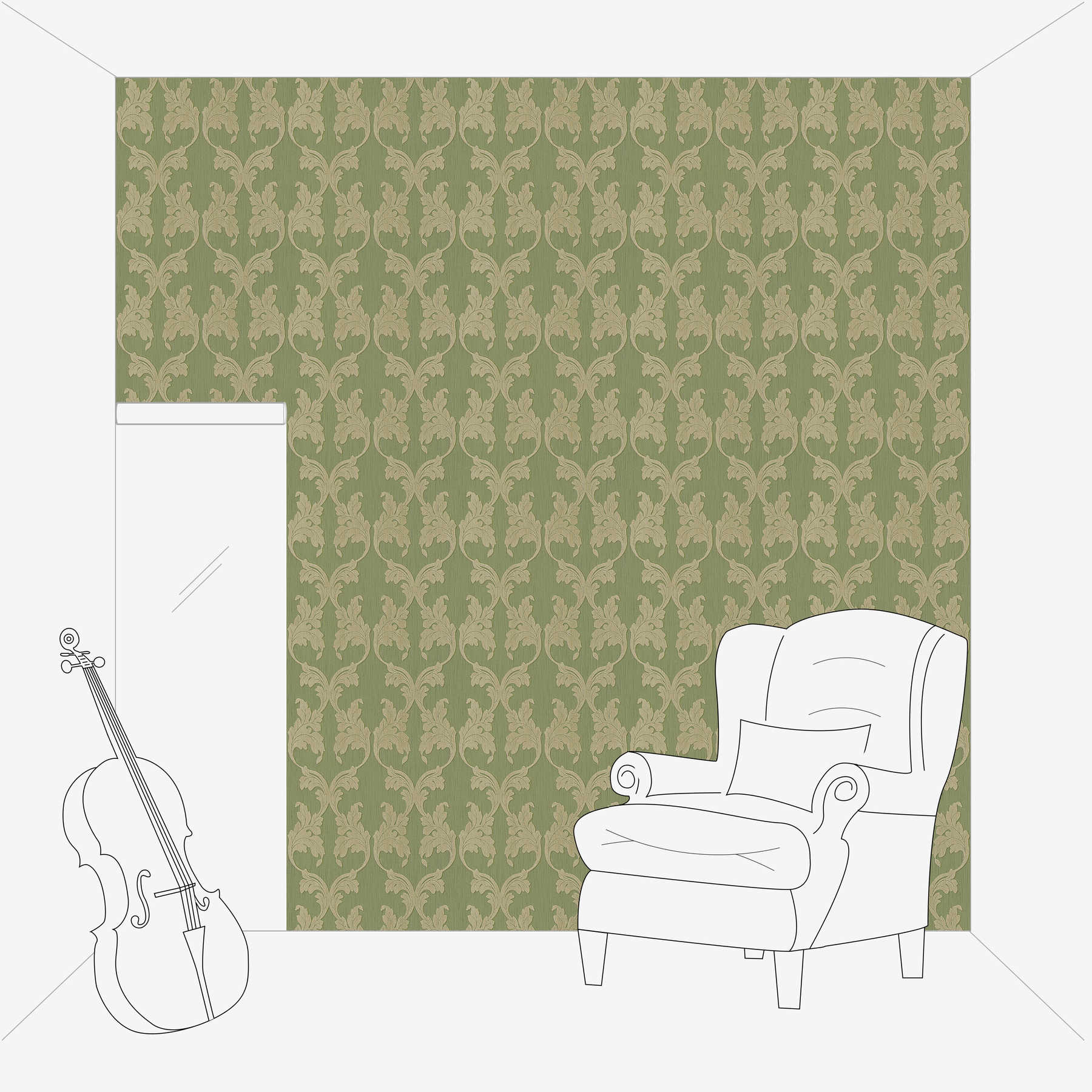 Das Tapetenmuster zeigt ein klassisches, ornamentales Design mit symmetrisch angeordneten, geschwungenen Blattformen. Der Hintergrund ist in einem sanften Olivgrün gehalten, das eine beruhigende und natürliche Wirkung ausstrahlt. Die Blattformen sind in einem goldbeigen Farbton gestaltet, was dem Muster Eleganz und einen leicht luxuriösen Touch verleiht. Die leicht texturierte Oberfläche der Tapete verstärkt den räumlichen Eindruck und verleiht Tiefe. Der Stil ist traditionell und fügt sich gut in ein klassisches Interieur ein, strahlt jedoch durch den subtilen Glanz der Ornamente auch eine zeitlose Modernität aus. Die Farbwelt wirkt warm und einladend, perfekt, um Räumen eine behagliche und zugleich edle Atmosphäre zu verleihen.