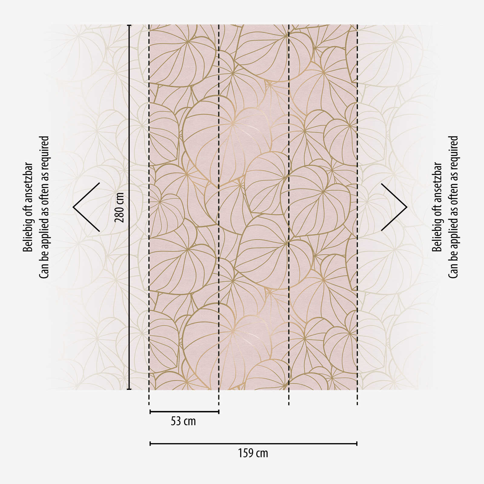 Diese Motivtapete macht aus deiner Wand einen Traum in Rosa & Gold. Das Metallic-Blättermuster sorgt für natürliche und elegante Stimmung und lässt kleine und große Mädchen-Herzen höher schlagen. Motivtapeten sind die kleine Schwester der Fototapete, sie zeigen große Muster, sind einfach tapeziert und lassen sich endlos aneinander reihen.