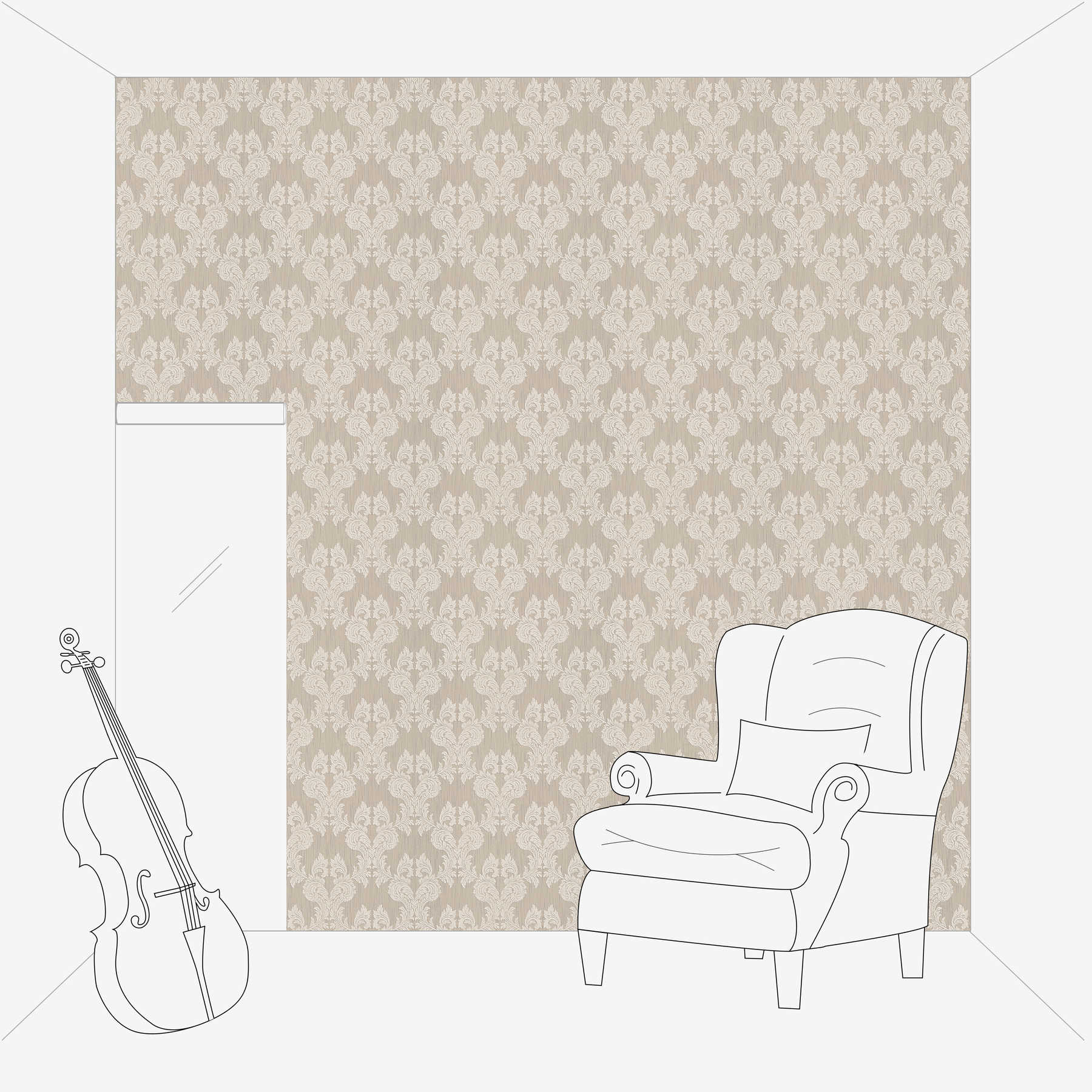 Das Tapetenmuster zeigt ein klassisches, florales Damast-Design mit symmetrischen, geschwungenen Ranken und Blättermotiven. Die Farben sind in einem sanften Taupe-Ton gehalten, der als Hintergrund dient, während das Muster selbst in einem weichen Off-White hervorsticht. Die Kombination aus neutralen Farben verleiht der Tapete eine elegante und zeitlose Wirkung, die sowohl beruhigend als auch raffiniert wirkt. Die strukturierte Oberfläche und das subtile Farbspiel betonen die feinen Details des Musters und schaffen eine Atmosphäre von Luxus und Klassik im Raum.