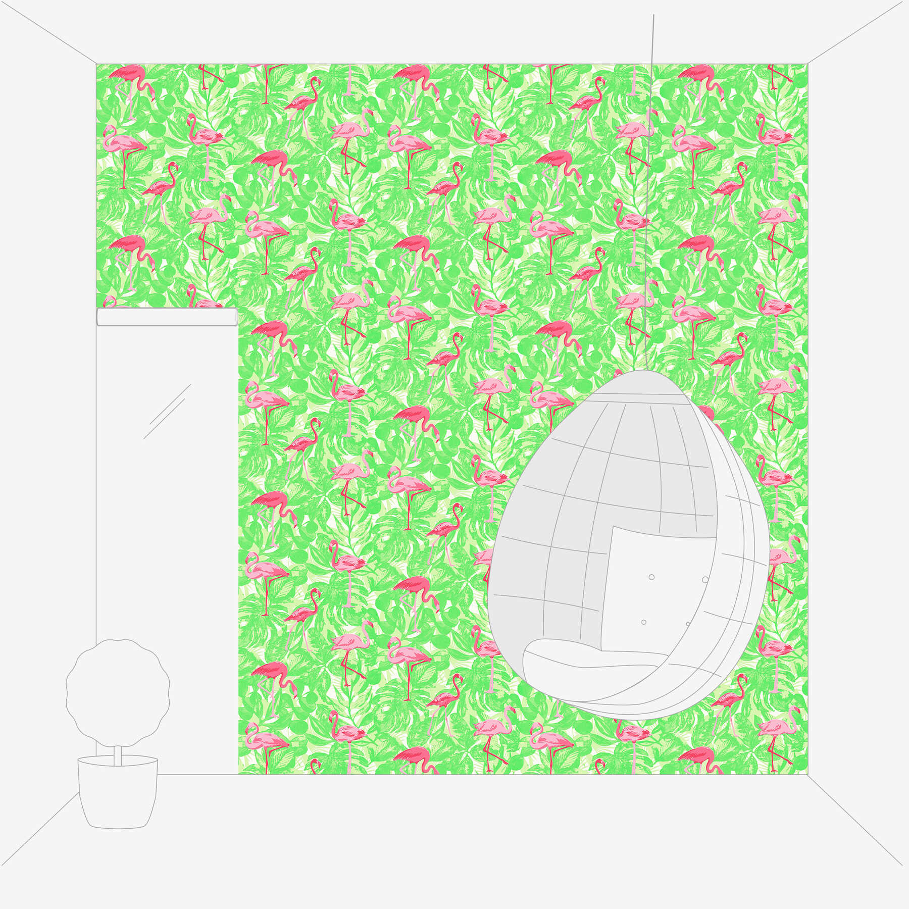 Tropische Tapete mit Flamingo & Blättern – Rosa, Grün