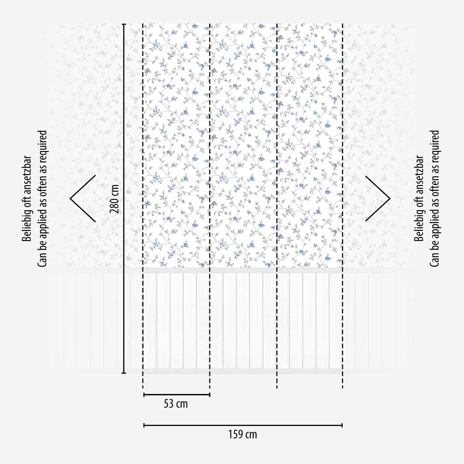 Vlies-Motivtapete mit Holz-Optik-Sockelborte und Blümchenmuster – Weiß, Grau, Blau