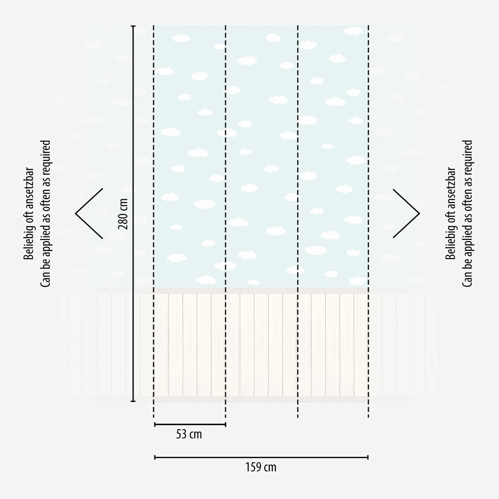 Vlies-Motivtapete mit Holz-Optik-Sockelborte und Wolken-Muster – Blau, Weiß, Grau