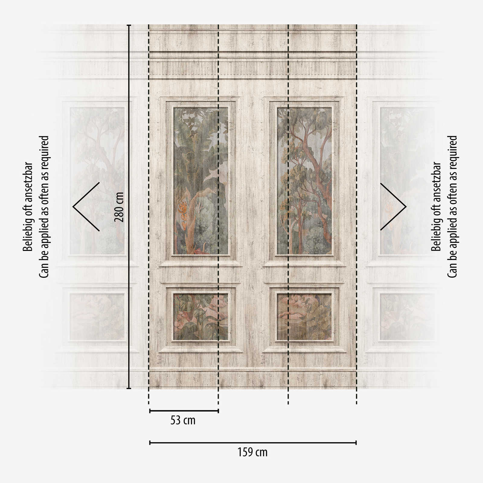 Vlies-Motivtapete mit Kassetierung und Waldmotiv im Vintage Look – Grau, Beige