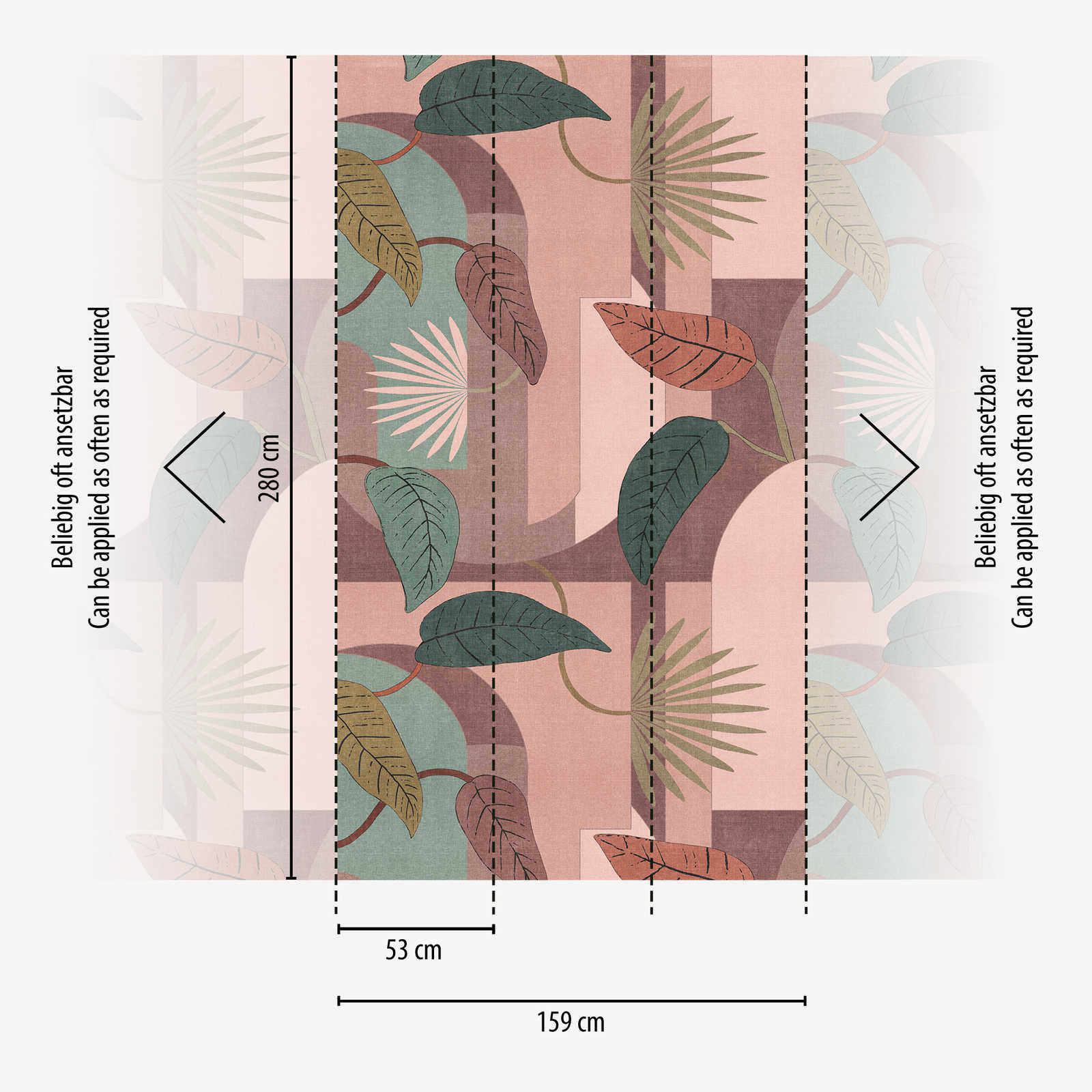 Der Stil ist modern und grafisch mit klaren Linien und geometrischen Formen, die durch die Anordnung der Blätter und der zarten Umrisse akzentuiert werden. Ein subtiler Vintage-Touch ist durch die gedämpften Farben und die stoffähnliche Textur des Designs spürbar, was dem Raum eine warme, einladende Atmosphäre verleiht.